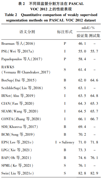 2)针对语义分割任务,根据不同粒度的弱监督形式,如边界框标注、图像级类别标注、线标注或点标注等,对语义分割研究进展进行总结分析。