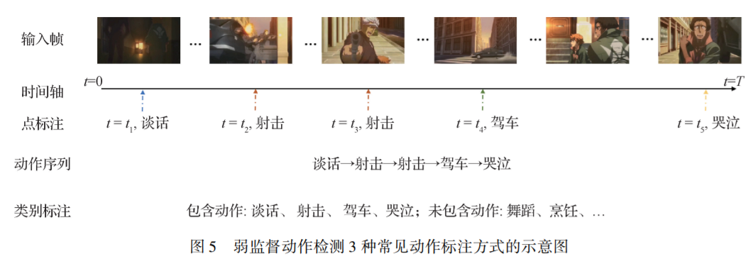 3)针对视频动作识别,从电影脚本、动作序列、视频级类别标签和单帧标签等弱监督形式,对弱监督视频动作识别的模型与算法进行回顾,并讨论了各种弱监督形式在实际应用中的可行性。