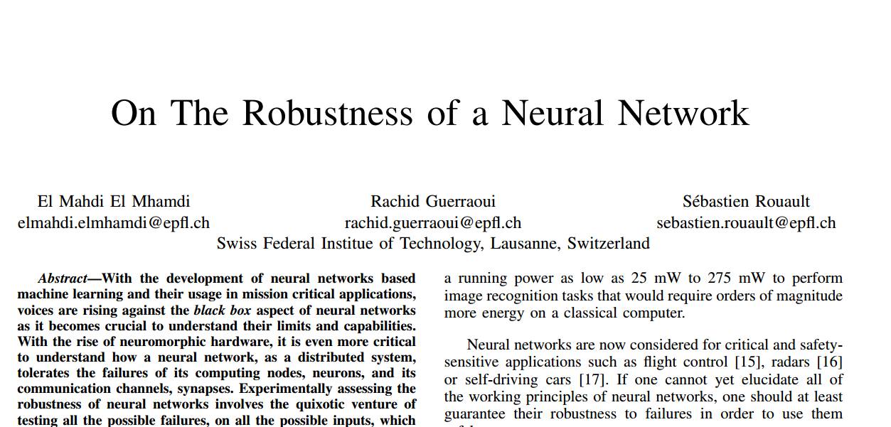 导语:2016年8月3日,IBM官方宣布了首个人造神经元,可用于制造高密度、低功耗的认知学习芯片。IBM瑞士苏黎世研究中心制成了世界上第一个人造纳米尺度随机相变神经元。同时,谷歌也在瑞士成立了美国本土之外最大的工程师办公中心,专注于机器学习。可以说,瑞士已经成为欧洲在机器学习领域最重要的阵地之一。近日,来自EPFL(瑞士洛桑联邦技术研究所)的三名研究员就针对神经网络、神经元芯片,以及其鲁棒性展开了论证和研究。我们一起来看看。