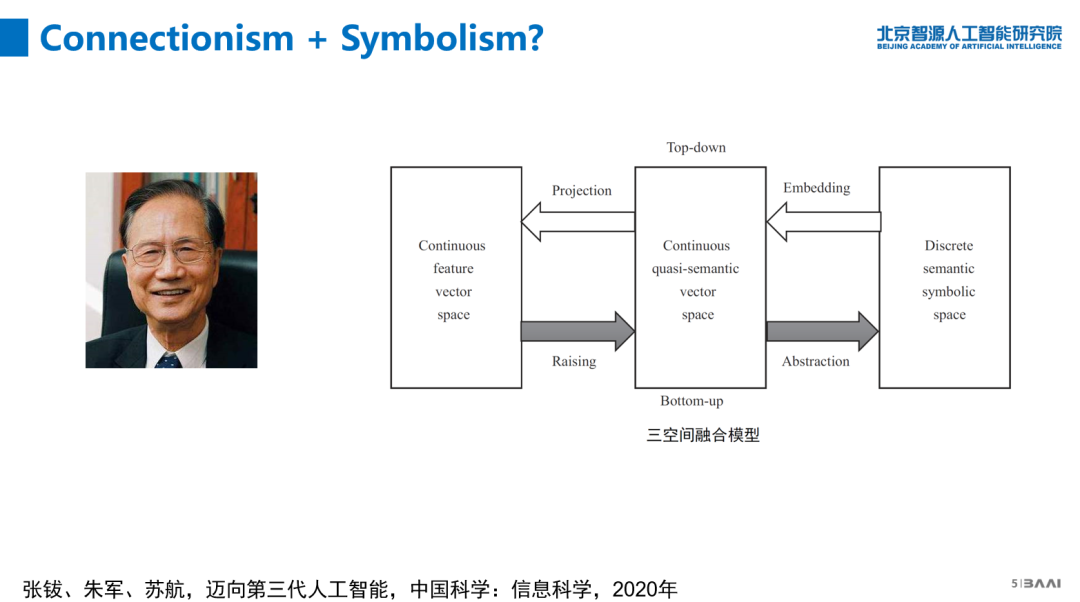 张院士近期在《中国科学:信息科学》上发表的文章提出“三空间融合”的模型,连接主义是完全在连续空间里,用feature等进行计算;符号主义完全是在离散空间进行计算。直接串通这两个领域有困难,所以他提出加个中间层,在中间进行计算,把计算结果返回两头。做个类比,相当做机器翻译时,中文和英文不能直接翻译,就都转到日文上面;这可能不是非常准确的类比,但道理是一样的,插入一个中间步骤,让难度下降。