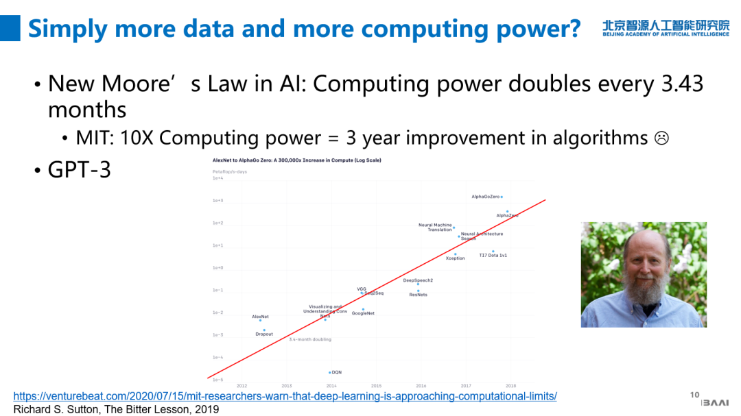 强化学习的鼻祖 Richard S. Sutton 在去年写了一个博客,对人工智能近70年进展感到非常悲观,他说这些进展都是算力引起的,不要以为算法在AI里面会起什么关键作用;人的算法在里面可能会起一定作用,但是并没有直接提升算力作用这么明显。今年GPT-3横空出世,直接把参数上升100倍,性能上马上有了质的变化,这好像也迎合了这个思潮,因此,是不是单纯堆算力和数据就能解决问题?