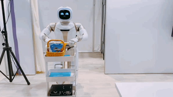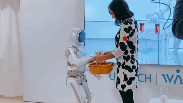 只见它推着满载食物的小车从等候室走出,放好车后和观众们打招呼,并把篮子拿给主持人。整个过程平稳流畅,可见它已经具备了优良的手眼协调抓取和全身协同能力。