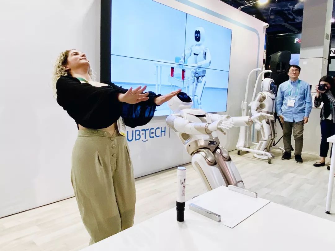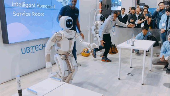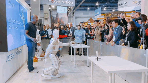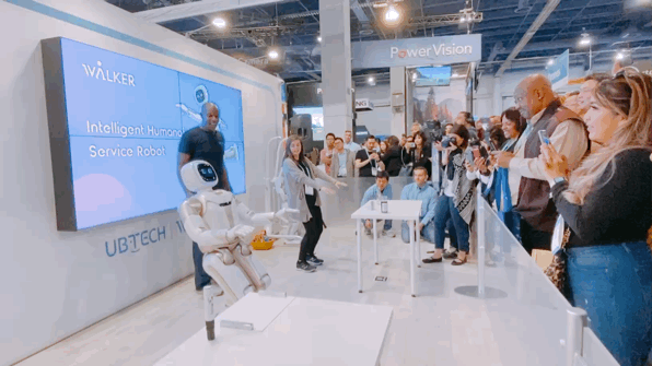 原来这个灵活炫酷的机器人是优必选科技的大型仿人服务机器人Walker,它在和观众们比赛下腰。