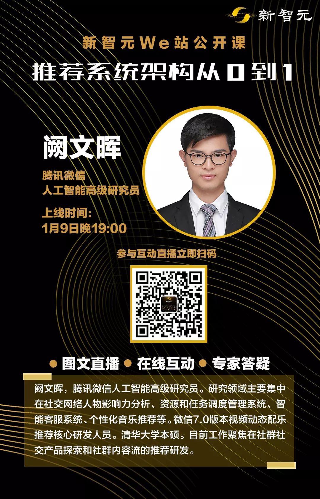 扫描下方海报二维码即刻报名「新智元We站公开课」:腾讯微信人工智能高级研究员的阙文晖手把手教你从0到1快速搭建推荐算法系统架构。