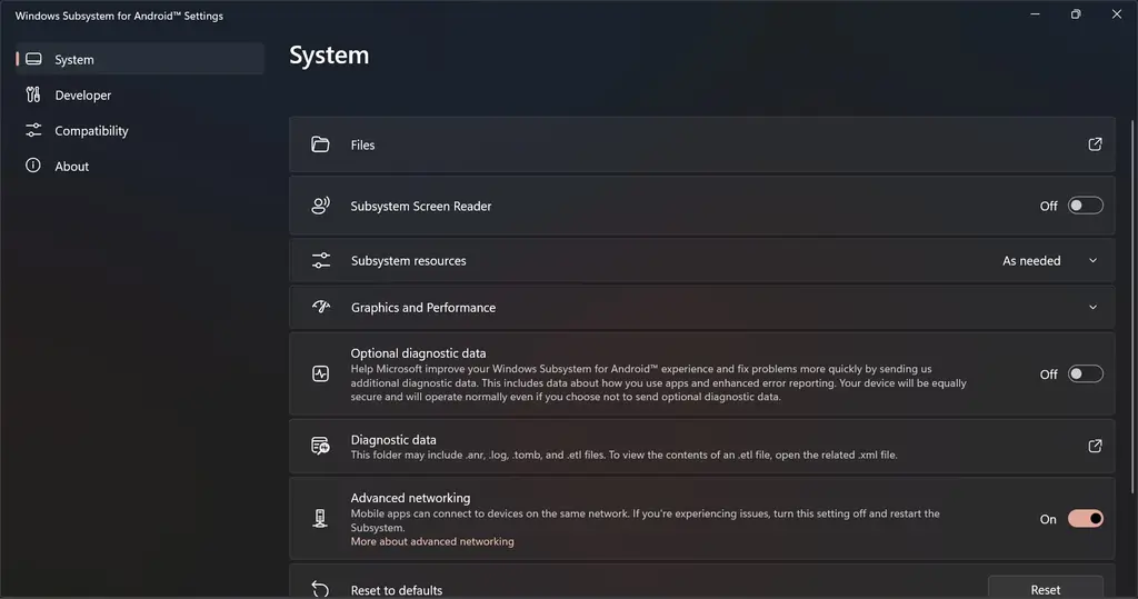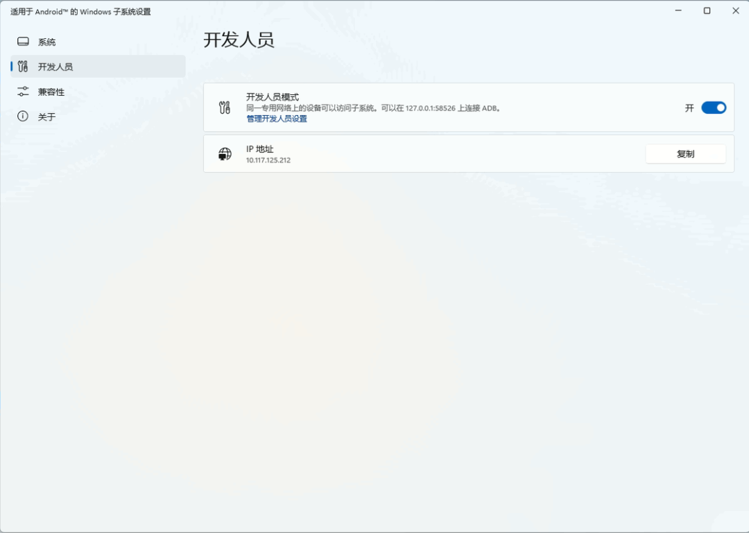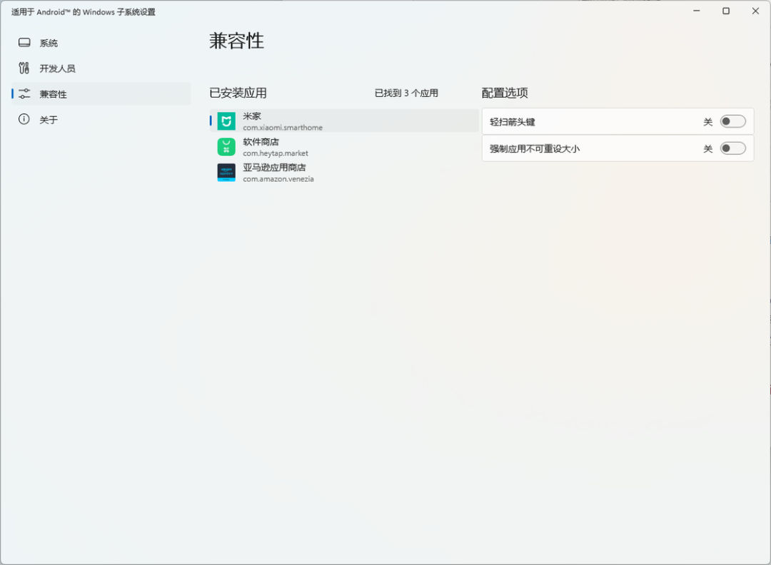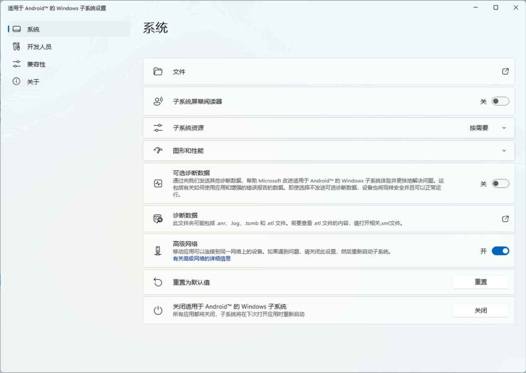 此前「开发人员模式」被正式移动到了独立的分组「开发人员」中,通过这个入口我们可以启动 WSA 的开发者模式,并使用 ADB 命令来手动安装应用;新的组中「兼容性」则可以对每一个安装的应用进行配置,比如说我们现在可以强制应用不可重设大小,以及轻扫箭头键等;此外,新版设置门户还增加了「可选诊断数据」和「高级网络」设置项——由于 WSA 是基于 Windows Subsystem for Linux 2 发展而来,因此一直以来WSA 都和 Windows 主系统不在一个网段中,这使得我们通过网络上访问子系统非常麻烦。