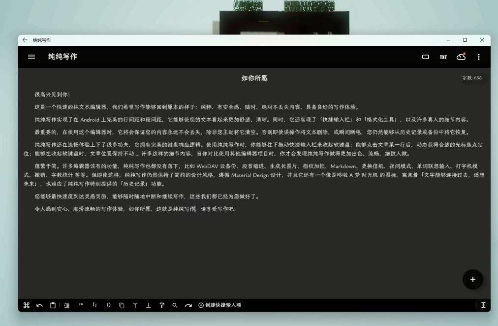相比此前,这个版本的 Android 最大优势在于有了更完善的大屏幕适配,Android 应用在 Windows 中的使用体验会更接近平板。比如说纯纯写作在新版的 WSA 上会直接展示为平板界面,使用体验上和 Windows 上的文本编辑软件无异,适配了 Android 大屏交互的应用也能响应 Windows 窗口尺寸变化在手机、平板布局间快速切换。
