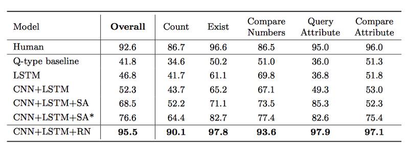 作者们指出,其他系统在准确性方面远远落后于他们自己的模型,这是因为关系网络旨在捕获关系。