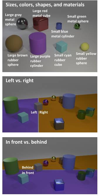 CLEVR数据集由不同形状,大小和颜色的对象的图像组成。该模型被问到及关于这些图像的问题,如: