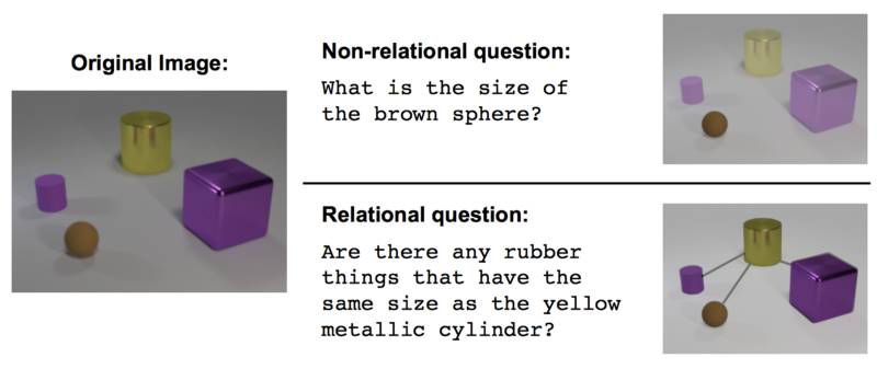 简单来说,关系推理尝试着去理解不同对象(概念)之间的关系,而这种推理被认为是智力的一个基本特征。作者们使用了一个信息图表来解释关系推理这一概念: