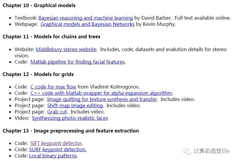 该书从基础的概率模型讲起,涵盖了计算机视觉领域常用的概率模型、回归分类模型、图模型、优化方法等,以及偏底层的图像处理、多视角几何知识,图文并茂,并辅以非常多的例子和应用,非常适合入门。在其主页:
