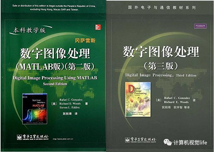 推荐使用冈萨雷斯的《数字图像处理(MATLAB版)》(英文原版2001年出版,中译版2005年)。不需要一上来就全部过一遍,只需要结合MATLAB学习一下基本原理、图像变换、形态学处理、图像分割,以上章节强烈建议按照书上手动敲一遍代码(和看一遍的效果完全不同),其他章节可快速扫描一遍即可。但这本书比较注重实践,对理论的解释不多,理论部分不明白的可以在配套的冈萨雷斯的《数字图像处理(第二版)》这本书里查找,这本书主要是作为工具书使用,以后遇到相关术语知道去哪里查就好。