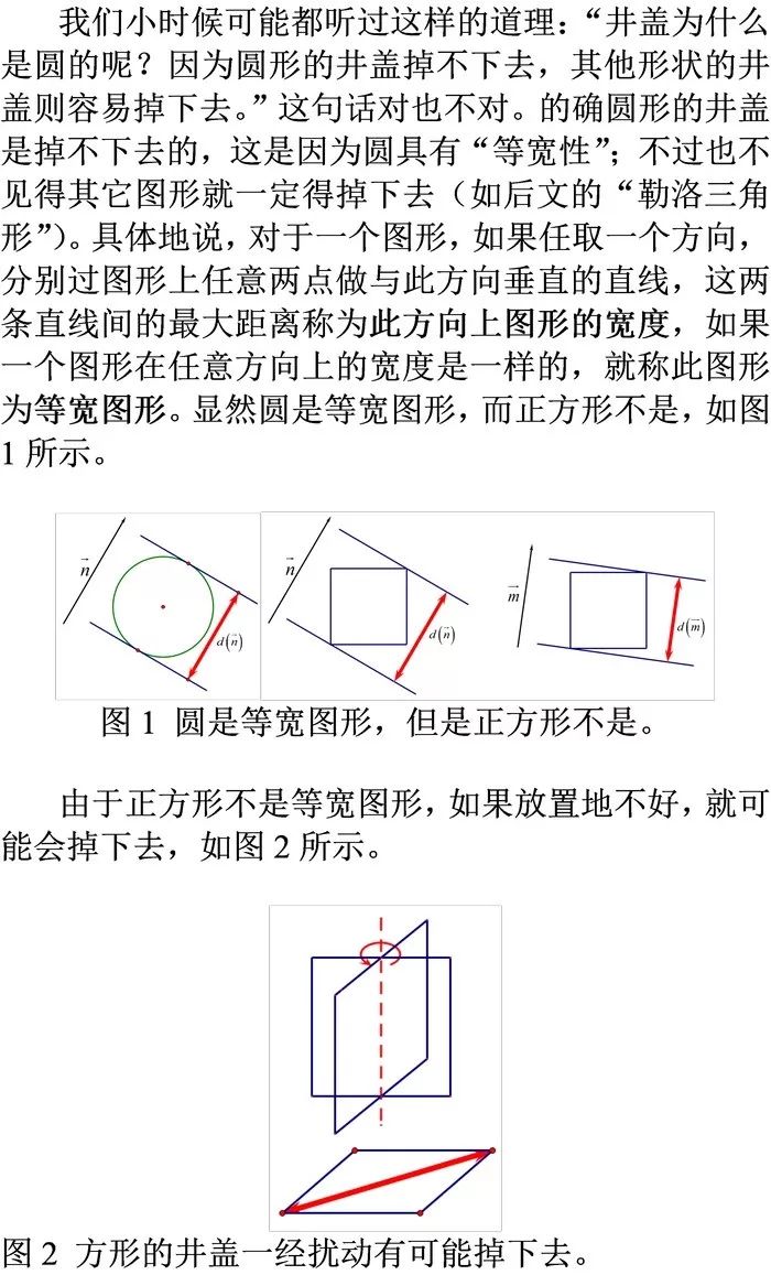 有很多非常深刻的数学方法,都是根植于问题的解决策略中。日常生活中常见的井盖、造金字塔时所用的滚木搬运法,不仅蕴含着“等宽图形”这种概念,而且其典型的研究方法就是近代几何中非常重要的活动标架法——陈先生曾经用此方法给出了高斯-博纳公式的内蕴证明,本文将从更初等的角度,以平面上等宽图形这一生活中常用图形为载体,在高中知识范围内去解释活动标架法的奇妙作用。