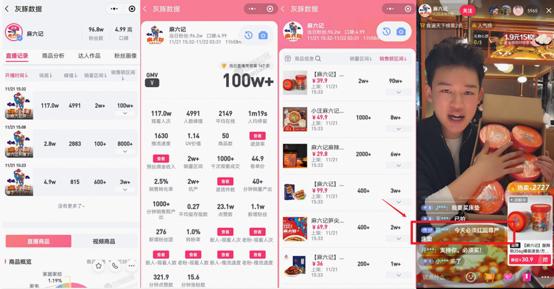 同样是11月21日,”麻六记“在当天下午15点多开启直播,持续到次日凌晨3点。这场11个小时的直播,为麻六记带来了超过100万元GMV,超过117万人次观看。其中,卖的最好的依然是酸辣粉,仅一个单品就贡献了超90万元GMV。直播间内,只有主播在卖力宣传产品,评论则是粉丝“打架”现场:“支持汪小菲,必须扛回尊严床垫”,另一方则反驳:“支持汪小菲的也经常婚内出轨吗?”最终,这场直播成为近期麻六记的巅峰,相较11月20日约10万元的GMV,21日翻了10倍,22日仅开播五小时,GMV再次突破100万元。