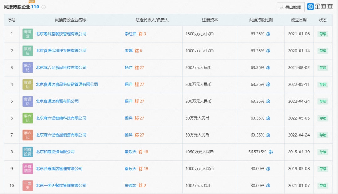 如今,根据企查查数据显示,无论是俏江南股份有限公司,还是北京俏江南投资控股有限责任公司,其股东名单里均未出现汪小菲和张兰。汪小菲的微博认证里只留下“北京食通达科技发展有限公司董事长、麻六记品牌创始人”。而北京食通达科技发展有限公司,正是北京麻六记餐饮管理有限公司、北京粤洱堂餐饮管理有限公司的股东——这两个熟悉的名字:麻六记、粤洱堂,则是汪小菲在2020年、2021年分别创办的川菜品牌和粤菜品牌。