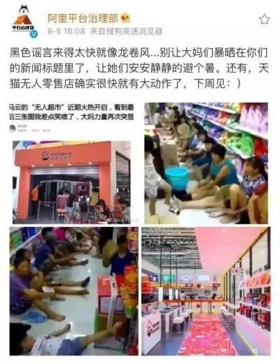 8月5日,阿里官方发布一则辟谣声明,表示黑色谣言来得太快就像龙卷风...别让大妈们暴晒在你们的新闻标题了,让她们安安静静的避个暑,又表示天猫无人零售店很快就有大动作。这是怎么回事?