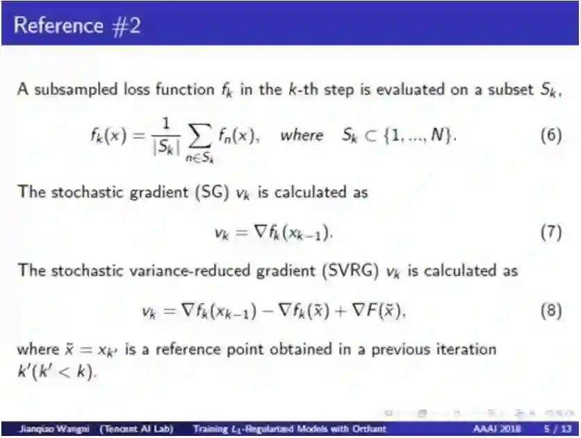 为了处理大规模互联网数据,研究者提出了很多用于加速训练过程的优化方法,比如随机梯度下降法 (SGD)。但是,SGD 通常需要衰减步长才能收敛,而且它的收敛率是次线性的 (sublinear)。近期出现了 SVRG (Rie Johnson, Tong Zhang) 和 SAGA (Aaron Defazio, Francis Bach) 等一些随机方差缩减方法,可以无需降低步长就能收敛,而且可以在光滑和强凸的模型上实现线性收敛率 (linear convergence rate)。在 SGD 方法中,第 k 步的下降方向 v_k 是在该数据集的一个随机子集 S_k 上进行评估的。在 SVRG 方法中,我们需要周期性地在一些参考点(比如 tilde-X)上计算一个准确梯度。这个准确梯度构成了 SVRG 的 v_k 的第三项,然后我们必须通过在 tilde-X 上减去一个随机梯度(这是在同一子集 S_k 上计算的)来平衡它的期望。