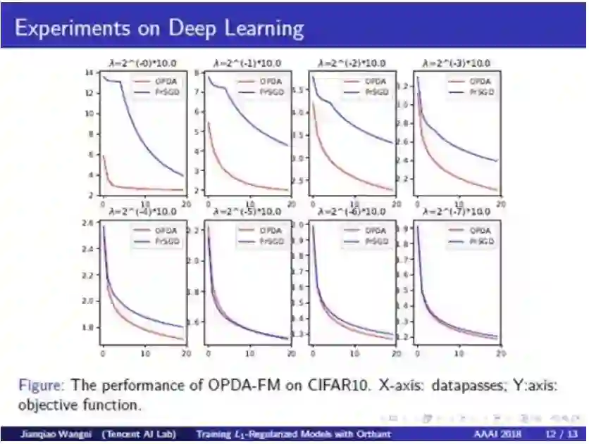 在本文中,我们提出了一种新的随机优化方法,随机象限性消极下降算法 (OPDA)。本算法的出发点是 L1 范数函数在任何一个象限内是连续可导的,因此,模型的参数在每一次更新之后被投影到上一次迭代时所在的象限。我们使用随机方差缩减梯度 (SVRG) 方法产生梯度方向,并结合伪牛顿法 (Quasi-Newton) 来使用损失函数的二阶信息。我们提出了一种新的象限投影方法,使得该算法收敛于一个更加稀疏的最优点。我们在理论上证明了,在强凸和光滑的损失函数上,该算法可以线性收敛。在 RCV1 等典型稀疏数据集上,我们测试了不同参数下 L1/L2 范数约束 Logistic 回归下该算法性能,其结果显著超越了已有的线性收敛算法 Proximal-SVRG,并且在卷积神经网络 (CNN) 的实验上超越 Proximal-SGD 等算法,证明了该算法在凸函数和非凸函数上均有很好的表现。