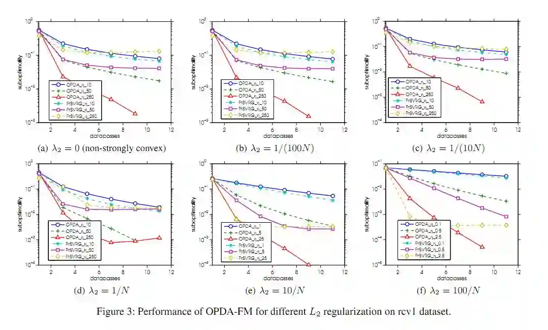 在凸函数上的实验:我们还使用 L2/L1 regularized Logistic 回归上进行了一些实验。在这一部分,我们将我们的方法与一个线性收敛算法 Prox-SVRG (Lin Xiao, Tong Zhang) 进行了比较。在这张图中,Y 轴表示解的次优性 (suboptimality),即当前目标函数与最小值之间的间隔;X 轴表示完整扫过数据集的次数。我们发现使用不同的步长以及 L2 和 L1 正则化系数时,OPDA 的速度稳定地超越了 Prox-SVRG 算法。