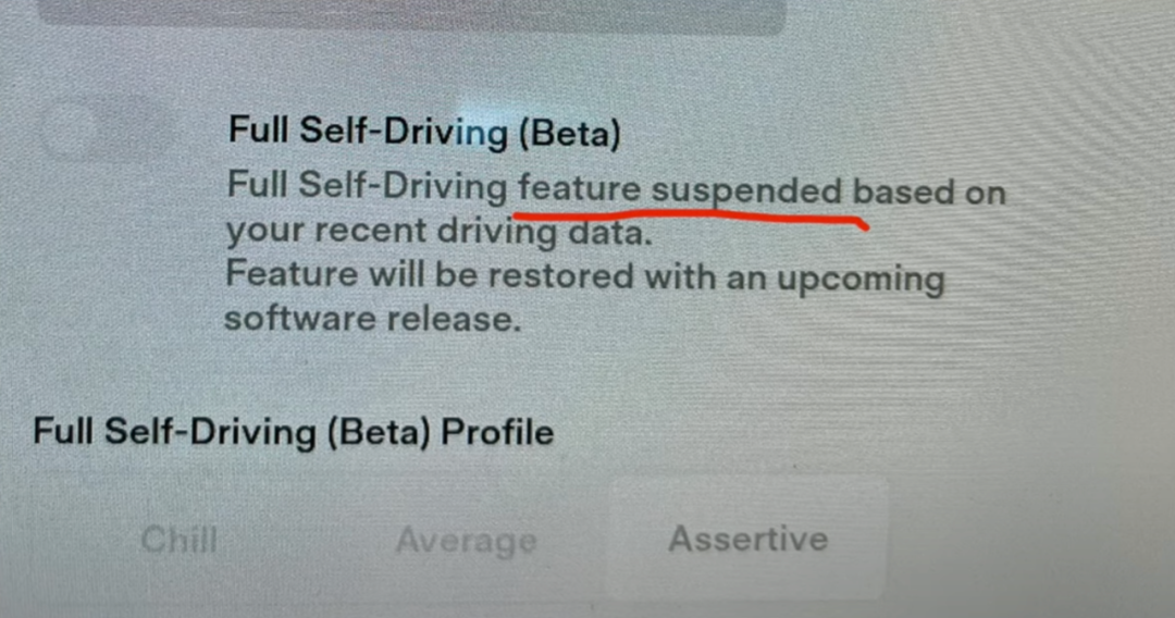 Bernal 分享了一张他的 Model 3 屏幕照片,FSD beta 已被暂停使用。图源:AI Addict。
