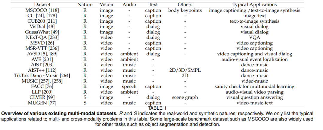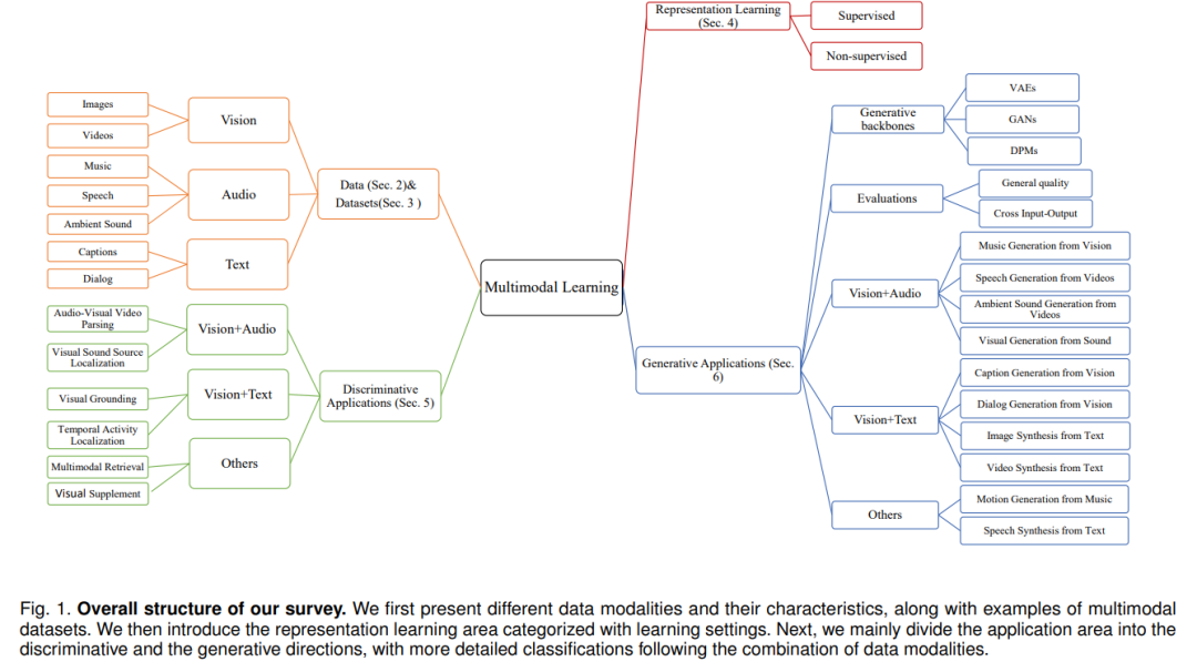 本文的总体结构如下: 在第2节中,首先从不同模态的数据特征方面进行了分析,包括视觉、音频、文本和运动表示。在第3节中介绍了多模态数据集,包括模态属性及其适用的多模态下游任务。然后,我们继续在第4节中介绍多模态表示学习,主要根据它们的学习设置进行分类。在第5节和第6节中,分别提出了具有判别式和生成式任务的具体多模态应用。除了任务和技术介绍之外,我们还做了额外的努力,将现有的文献与第2节中提到的数据特征联系起来,揭示在特定的方法和模型中处理和处理哪些数据属性。上述回顾构成了我们在第7节讨论现有挑战和未来可能方向的基础。第8节包括最后的评论和结论。其主要结构也如图1所示。