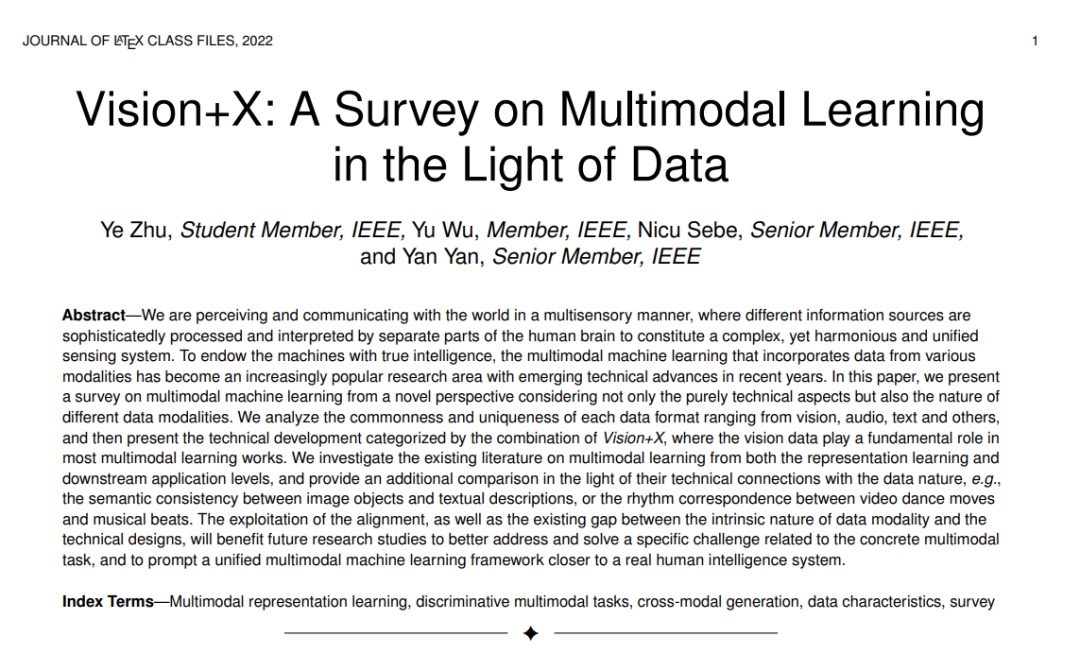 我们以多感官的方式感知世界,与世界交流,不同的信息源经过人脑不同部位的复杂处理和解释,构成一个复杂而和谐统一的感知系统。为了赋予机器真正的智能,融合不同模态数据的多模态机器学习近年来随着技术的不断进步,成为一个日益热门的研究领域。本文从一个新的角度对多模态机器学习进行了综述,不仅考虑了纯技术方面,而且还考虑了不同数据模态的性质。我们分析了从视觉、音频、文本等各个数据格式的共性和独特性,然后以视觉+X的组合分类介绍了技术发展,其中视觉数据在大多数多模态学习工作中发挥着基础作用。我们从表征学习和下游应用两个层面研究了现有的多模态学习文献,并根据它们与数据本质的技术联系进行了额外的比较,例如,图像对象和文本描述之间的语义一致性,或视频舞蹈动作和音乐节拍之间的节奏对应关系。这种对齐的开发,以及数据模态的内在本质与技术设计之间存在的差距,将有助于未来的研究,更好地解决与具体多模态任务相关的具体挑战,并促进统一的多模态机器学习框架更接近真实的人类智能系统。
