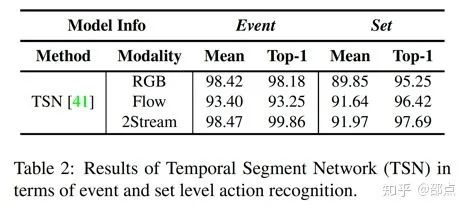 实验分析的主要关注点在最细粒度的元素类别识别。在此之前,我们先简要在较粗糙粒度上(event&set),进行了相关实验和分析。由于粗粒度实验不是重点,我们选取了当前业界广泛应用的方法——TSN,以点带面。实验结果如下: