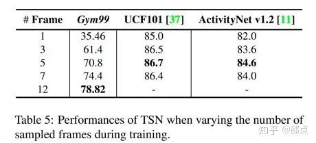 如下面的实验数据所示,在UCF上只用2.7%的采样率(5帧)TSN的识别准确率就达到了饱和,而在FineGym上的元素类别识别则需要采样30%(12帧)以上的数据帧。