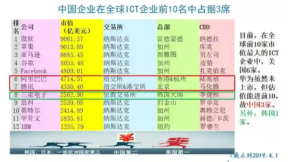 相比发达国家而言,中国在网信领域虽然整体上仍是跟跑,但有些方面已出现了跟跑、并跑、领跑并存的局面,我们要继续努力,争取更多的并跑、领跑。如前所述,目前,在全球前10家市值最大的ICT企业中,美国有6家,中国有3家,华为公司虽然未上市,但估值能进前10。另外,韩国有1家。这种格局大致反映了网信领域各国的实力。