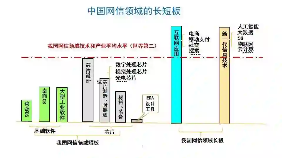 我国网信领域的短板主要在基础软件和芯片两个方面。其中,基础软件的短板主要在OS(包括移动OS和桌面OS)以及工业软件,芯片的短板主要在EDA(电子设计自动化)设计工具,材料、装备,以及制造等方面。在补齐短板方面,我们还要下很大的功夫、花费较长的时间。