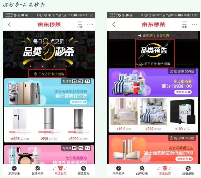 同样顾名思义,品类秒杀即按各品类进行分类,比如冰箱、礼盒、床上三件套等。