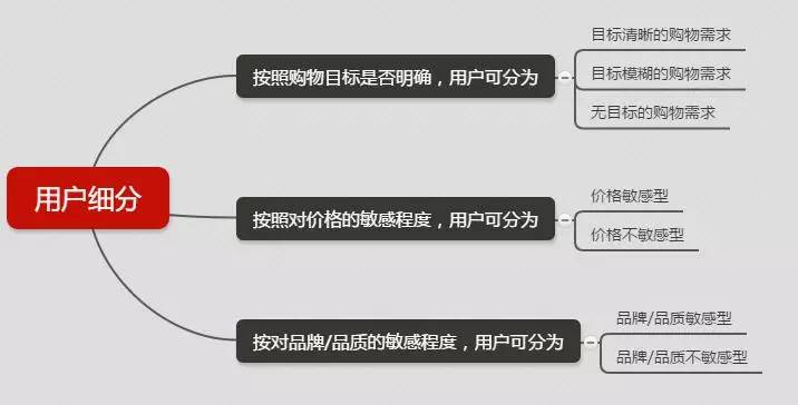 我按照三个维度来划分用户,“购物目标是否明确”、“是否对价格敏感”、“是否对品牌/品质敏感”,具体如下图所示: