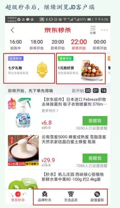 “超级秒杀”值得深聊。假如用户在高流量场次(8点、10点、18点、20点等)首先打开了JD秒杀,去抢“超级秒杀”的商品。