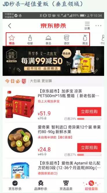 超值量贩本质上为垂直领域的秒杀,分为母婴、食品、酒饮等垂直细分领域。