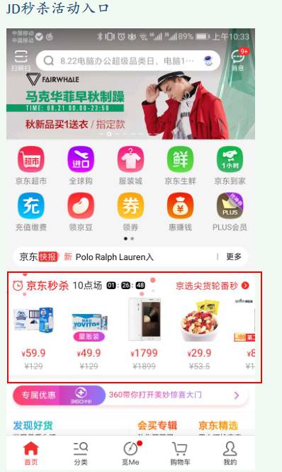JD秒杀的页面在移动端和PC端均可进入,考虑到目前电商均向移动端发力,以下的介绍均围绕移动端进行。