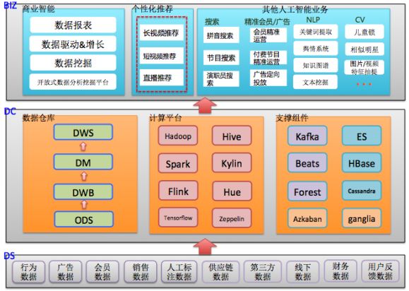 大数据与人工智能具有千丝万缕的关系,互联网公司一般会构建自己的大数据与人工智能团队,构建大数据基础平台,基于大数据平台构建上层业务,包括商业智能(BI),推荐系统及其他人工智能业务,下图是典型的基于开源技术的视频互联网公司大数据与人工智能业务及相关的底层大数据支撑技术。