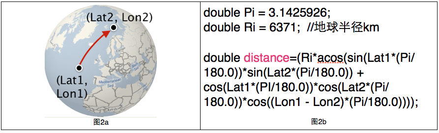 插句题外话,计算经纬度之间的距离不能像求欧式距离那样平方开根号,因为地球是个不规整的球体(图2a),普通计算适合都是默认按最简单的完美球体假设,两点之间的距离函数应该如图2b所示。