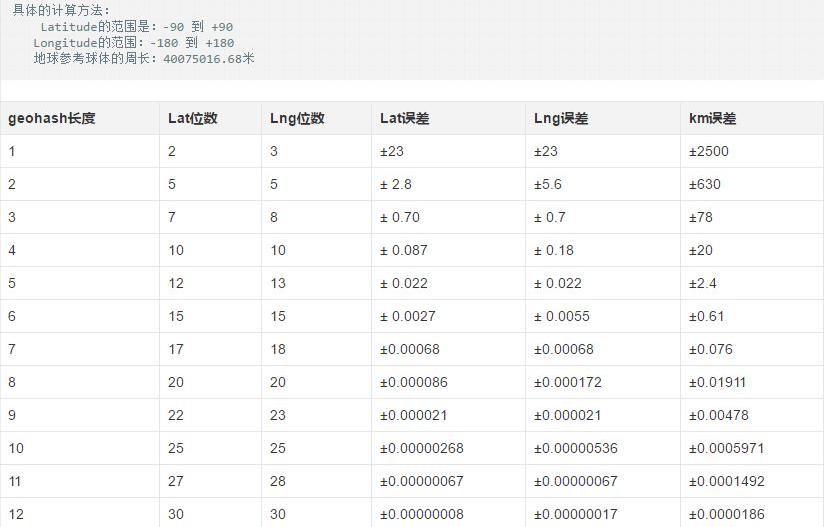可以看出,当geohash base32编码长度为8时,精度在19米左右,而当编码长度为9时,精度在2米左右,编码长度需要根据数据情况进行选择。