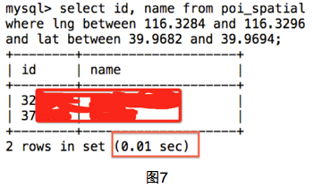 根据这个思路我们执行SQl查询(图5)(注:经度或纬度每隔0.001度,距离相差约100米,由此推算出矩形左下角和右上角坐标),发现过滤后正好剩下两个POI。