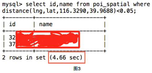 该方法的复杂度为:40万*距离函数。我们将球体距离函数写为mysql存储过程distance,之后我们执行查询操作(图3),发现花费了4.66秒。