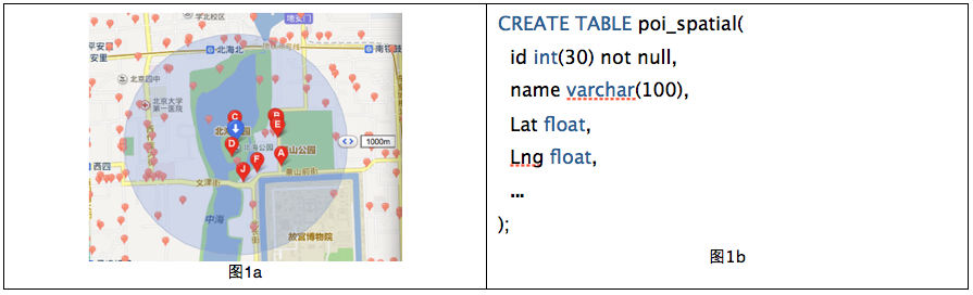 如何根据自己所在位置查询来查询附近50米的POI(point of interest,比如商家、景点等)呢(图1a)?