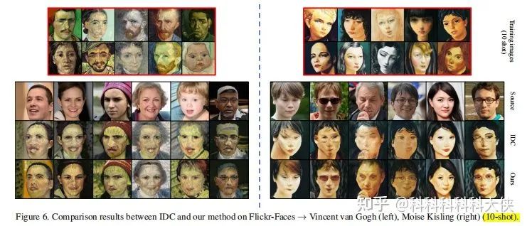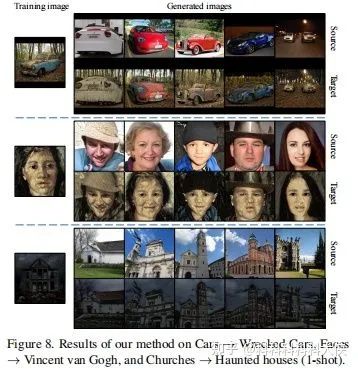 源域预训练模型包括三种,StyleGAN2在FFHQ、LSUN Churches、LSUN Cars预训练得到,适配到face Sketches, face paintings by Van Goph, face paintings by Moise Kisling,Haunted houses,village painting by Van Goph和wrecked/abandoned cars. 目标域的样本数设定包括10,5,1-shot。