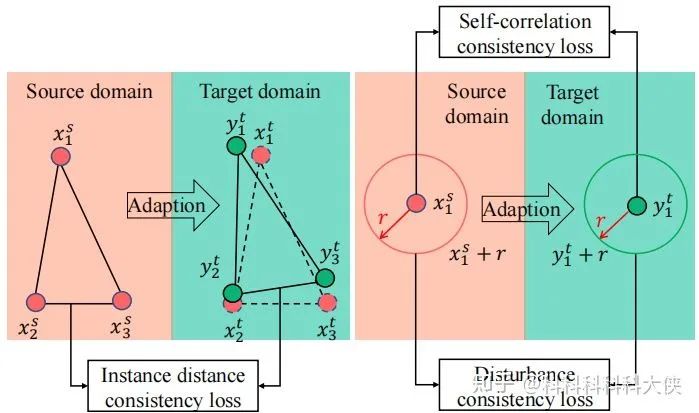将源域丰富的结构信息适配到目标域,通过跨域空间结构一致性损失实现,具体包括两项,一个是自相关一致性损失(self-correlation consistency loss),另一个是扰动相关一致性损失(disturbance correlation consistenty loss),前者对于目标域生成器和源域生成器生成的样本对进行约束,控制其对结构信息的学习,后者有助于对齐潜在空间中相邻样本之间的空间互相关性,以约束目标域生成器对特定实例的变化趋势的一致性。