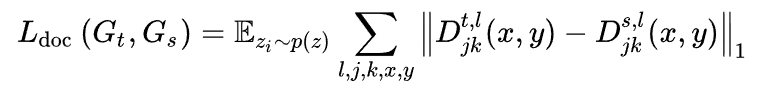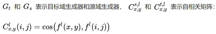 fl 表示第 l 层的特征图, fl(x, y) 表示一个 c 维向量,计算不同位置与(x,y)之间的余弦相似度,相当于记录下了feature中各个位置之间的距离和相关性,对源域生成器和目标域生成器之间的自相关矩阵进行约束,可以实现将源域的结构适配到目标域的目的。