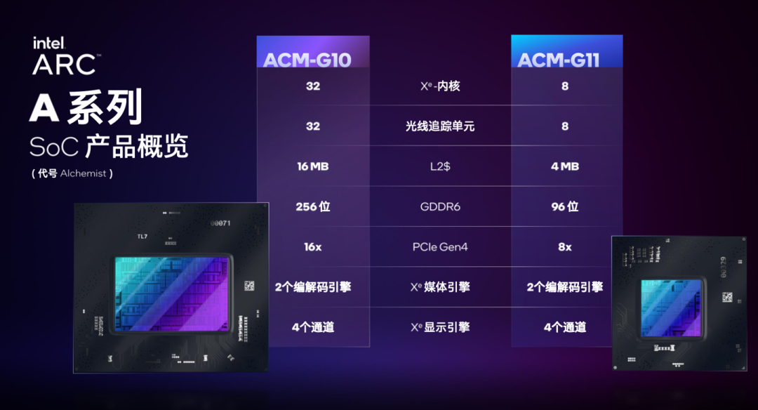 据官方介绍,英特尔锐炫 A 系列全部基于 Xe HPG 架构打造,包含通用架构和高级功能集并且支持 DX12 Ultimate,还拥有 AI 引擎和增强的媒体引擎。规格方面,英特尔锐炫 A 系列 SoC 有两种规格,其中 ACM-G10 的面积更大,包含 32 个 Xe 内核和 32 个光追单元,16MB L2 缓存,256bit GDDR6 接口,16 路 PCIe4.0 接口。ACM-G11 的面积较小,拥有 8 个 Xe 内核和 8 个光追单元,4MB L2 缓存,96bit 显存接口,8 路 PCIe 4.0。