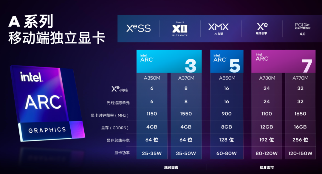 英特尔今日宣布推出面向笔记本电脑的英特尔锐独立显卡系列,这是英特尔锐炫 A 系列显卡产品组合中率先发布的独立显卡。据了解,此次锐炫 A 系列移动端独立显卡分为三档:Arc 锐炫 3 系列定位主流游戏,Arc 锐炫 5 系列定位性能游戏,Arc 锐炫 7 系列定位硬核性能游戏。其中 Arc 锐炫 5 系列和 7 系列内置更多 Xe 内核,拥有更加强大的图形和计算性能。