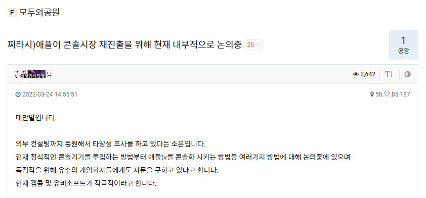 有传言称,苹果将重返游戏机市场,在 Clien 论坛上有爆料者表示,中国台湾供应链中传出苹果考虑重返游戏行业的消息,该公司正在借助外部咨询管理有关人员进行可行性研究。