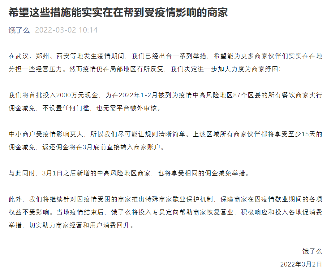 饿了么官方微信公众号发布消息称,公司将首批投入2000万元现金,为在2022年1-2月被列为疫情中高风险地区87个区县的所有餐饮商家实行佣金减免,不设置任何门槛,也无需平台额外审核。