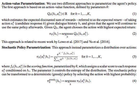 There are 22 response models in the system, including neural network based retrieval models, neural network based generative models, knowledge base question answering systems and template-based systems. Examples of candidate model responses are shown in Table 1 along with the model names. For a description of these models, the reader is referred to the technical report by Serban et al. [2017]. 4 Model Selection Policy After generating the candidate response set, the dialogue manager uses a model selection policy to select the response it returns to the user. The dialogue manager must select a response which increases the satisfaction of the user for the entire dialogue. In order to do this, it must make a trade-off between immediate and long-term user satisfaction. For example, suppose the user asks to talk about politics. If the dialogue manager chooses to respond with a political joke, the user may be pleased for one turn. Afterwards, however, the user may be disappointed with the system’s inability to debate political topics. Instead, if the dialogue manager chooses to respond with a short news statement, the user may be less pleased for one turn. However, this may influence the user to follow up with factual questions, which the system may be better adept at handling. To make the trade-off between immediate and long-term user satisfaction, we consider selecting the appropriate response as a sequential decision making problem. This section describes the five approaches we have investigated to learn the model selection policy. The approaches are evaluated with real-world users in the next section.
