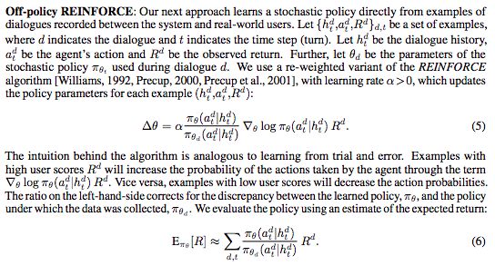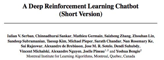 Conversational agents - including chatbots and personal assistants - are becoming increasingly ubiquitous. In 2016, Amazon proposed an international university competition with the goal of building a socialbot: a spoken conversational agent capable of conversing with humans on popular topics, such as entertainment, fashion, politics, sports, and technology.3 This article describes the experiments by the MILA Team at University of Montreal, with an emphasis on reinforcement learning. Our socialbot is based on a large-scale ensemble system leveraging deep learning and reinforcement learning. The ensemble consists of deep learning models, template-based models and external API webservices for natural language retrieval and generation. We apply reinforcement learning — including value function and policy gradient methods — to intelligently combine an ensemble of retrieval and generation models. In particular, we propose a novel off-policy model-based reinforcement learning procedure, which yields substantial improvements in A/B testing experiments with real-world users. On a rating scale 1−5, our best performing system reached an average user score of 3.15, while the average user score for all teams in the competition was only 2.92. 4 Furthermore, our best performing system averaged 14.5−16.0 turns per conversation, which is significantly higher than all other systems. 1 School of Computer Science, McGill University. 2CIFAR Fellow. 3 See https://developer.amazon.com/alexaprize. 4Throughout the semi-finals, we carried out several A/B testing experiments to evaluate different variants of our system (see Section 5). The score 3.15 is based on the best performing system in these experiments. 31st Conference on Neural Information Processing Systems (NIPS 2017), Long Beach, CA, USA. arXiv:1801.06700v1 [cs.CL] 20 Jan 2018 As shown in the A/B testing experiments, a key ingredient to achieving this performance is the application of off-policy deep reinforcement learning coupled with inductive biases, designed to improve the system’s generalization ability by making a more efficient bias-variance tradeoff.