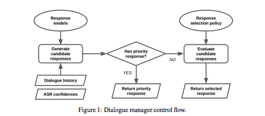 Our system architecture is inspired by the success of ensemble-based machine learning systems. These systems consist of many independent sub-models combined intelligently together. Examples of such ensemble systems include the winner of the Netflix Prize [Koren et al., 2009], the IBM Watson questionanswering system [Ferrucci et al., 2010] and Google’s machine translation system [Wu et al., 2016]. Our system consists of an ensemble of response models (see Figure 1). Each response model takes as input a dialogue history and outputs a response in natural language text. As will be explained later, the response models have been engineered to generate responses on a diverse set of topics using a variety of strategies. The dialogue manager is responsible for combining the response models together. As input, the dialogue manager expects to be given a dialogue history (i.e. all utterances recorded in the dialogue so far, including the current user utterance) and confidence values of the automatic speech recognition system (ASR confidences). To generate a response, the dialogue manager follows a three-step procedure. First, it uses all response models to generate a set of candidate responses. Second, if there exists a priority response in the set of candidate responses (i.e. a response which takes precedence over other responses), this response will be returned by the system. For example, for the question "What is your name?", the response "I am an Alexa Prize socialbot" is a priority response. Third, if there are no priority responses, the response is selected by the model selection policy. For example, the model selection policy may select a response by scoring all candidate responses and picking the highest-scored response. 2 Table 1: Example dialogues and candidate responses generated by response models. The chosen system response is marked in bold.